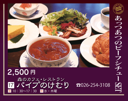Warm up with our piping hot beef stew set! This popular handmade set features homemade bacon in the stew. You can also choose an original cake. Lunch reservations available. Check Instagram or the map before visiting. (Parking for 6 cars)