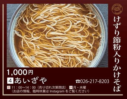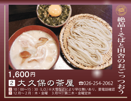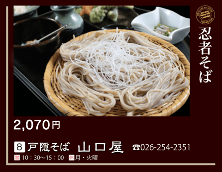 When you order the designated menu at participating restaurants, you’ll receive one stamp per menu item. The more stamps you collect, the more prizes you can win. Come enjoy Togakushi’s winter through delicious local cuisine.